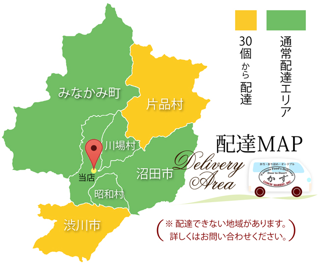 めしやかずは群馬県沼田市の宅配弁当店でございます。平成八年に創業以来、地元のお客様のみならず、イベント・行楽等で県外からお越しのお客様にも地元の味をお届けすることでお喜びいただいております。